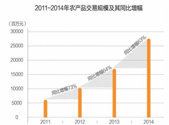 數(shù)據(jù)最容易說(shuō)話,就拿淘寶和天貓平臺(tái)來(lái)說(shuō),2011年農(nóng)產(chǎn)品銷(xiāo)售額為57億元,2013年攀升至170億元,2014年更達(dá)到了277億元,幾乎一年上一個(gè)臺(tái)階。