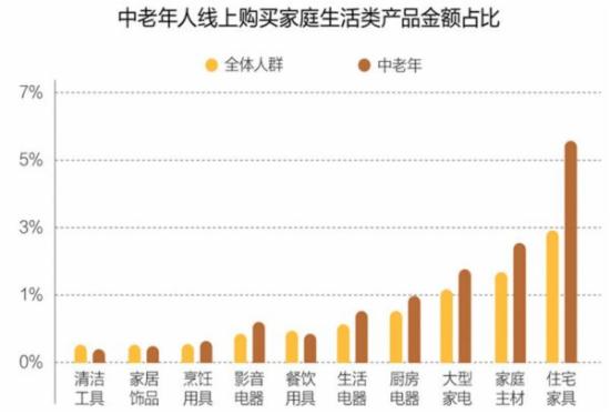 線上消費(fèi)的數(shù)據(jù)顯示,中老年人購(gòu)買(mǎi)家庭生活類(lèi)產(chǎn)品的金額占比僅次于服飾類(lèi),排名第二,且在逐年增加。2014年底達(dá)到17.21%,比全體人群高出5%。