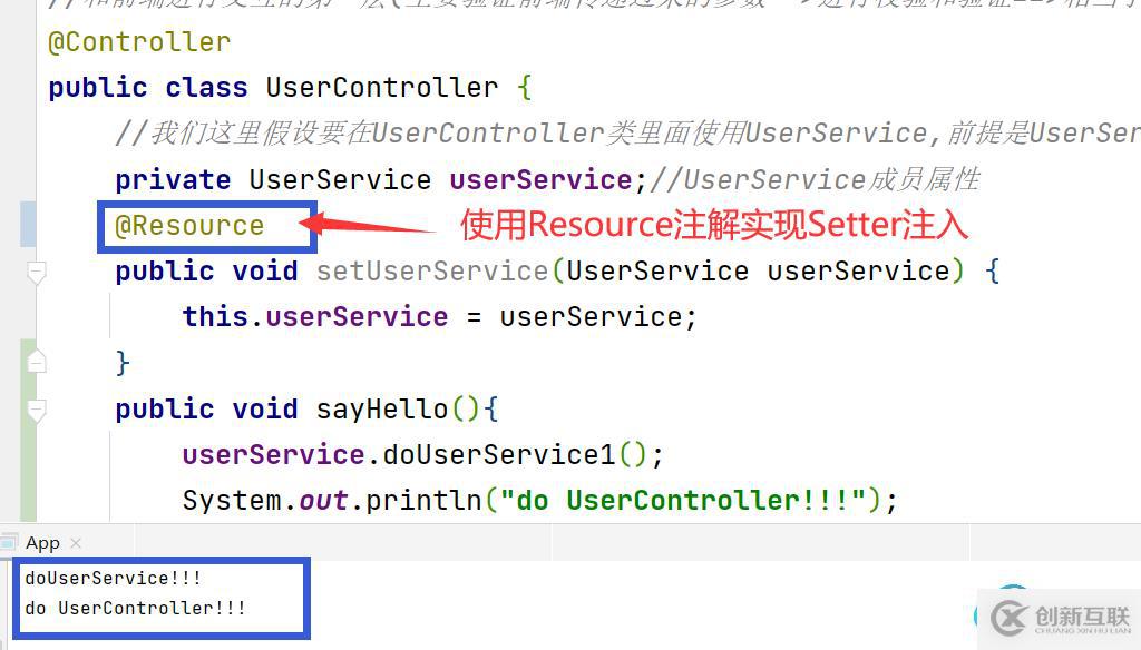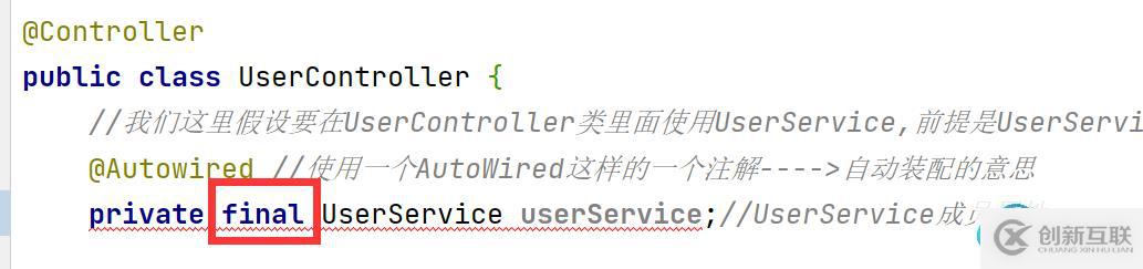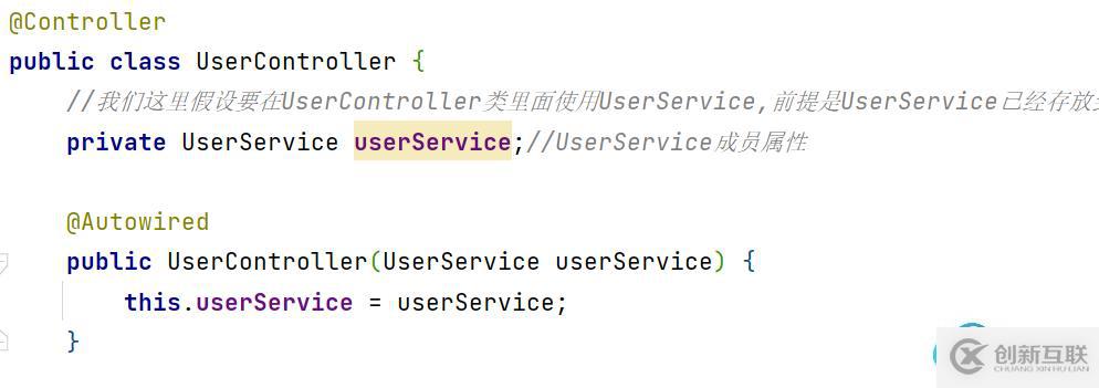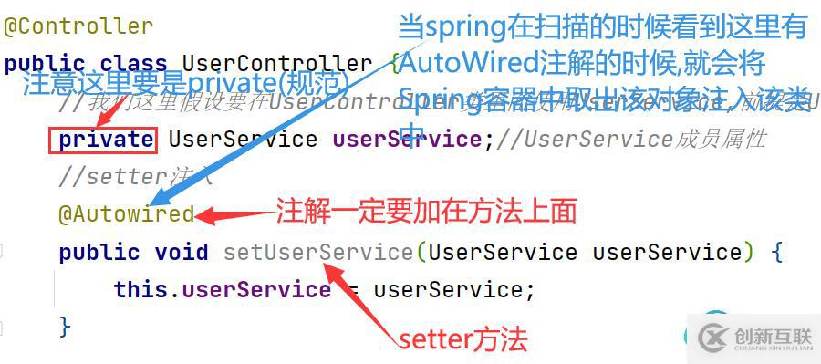 @Autowired //使用一個(gè)AutoWired這樣的一個(gè)注解---->自動(dòng)裝配的意思 private UserService userService;//UserService成員屬性