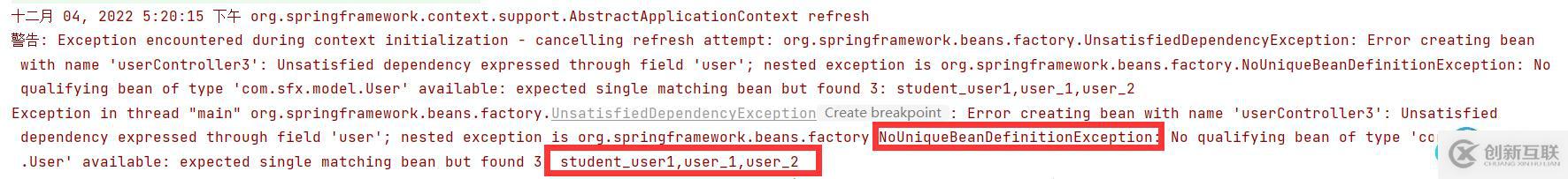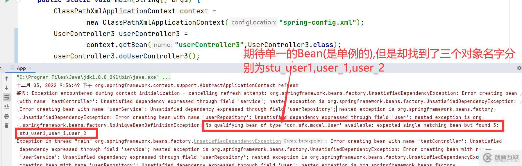 }現(xiàn)在有三個(gè)類型為User的Bean,但是三個(gè)Bean的名稱并不一樣,因?yàn)镾pring中規(guī)定Bean的名稱(也就是id)是唯一的.