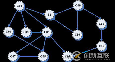 學(xué)期總數(shù):6;學(xué)分上限:10;該專業(yè)共開設(shè)12門課,課程號從C01到C12,學(xué)分順序?yàn)?,3,4,3,2,3,4,4,7,5,2,3,先修關(guān)系如下圖。
