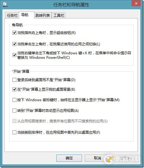 另外一個(gè)大家呼吁已久的問題便是開機(jī)之后直接進(jìn)入桌面,在Windows 8.1中已經(jīng)可以通過任務(wù)欄屬性進(jìn)行設(shè)置。同樣在任務(wù)欄屬性中,還可以統(tǒng)一開始屏幕背景與桌面壁紙、替換神秘菜單中cmd為PowerShell、左右上角的功能等相關(guān)設(shè)置。