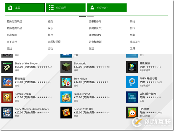 同樣,Windows Store的改變也是有目共睹的。在布局分類上的改變更易發(fā)現(xiàn)精彩的應(yīng)用,由左到右依次為精品聚焦、當(dāng)下流行、新品推薦、Top paid和Top Free。比較可惜的是沒有像Windows 8 Preview時(shí)那樣全場免費(fèi),不過還好有很多應(yīng)用可以試用。