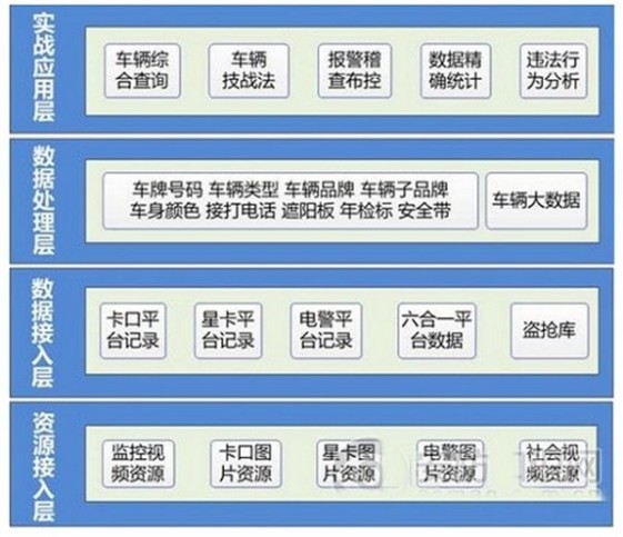 數(shù)據(jù)接入層:實(shí)現(xiàn)平臺間的數(shù)據(jù)對接和分類匯聚整理,卡口平臺和電警平臺的非結(jié)構(gòu)化和半結(jié)構(gòu)化過車數(shù)據(jù)用于深度識別分析,六合一平臺、車駕管庫、盜搶庫等結(jié)構(gòu)化數(shù)據(jù)可接入車輛大數(shù)據(jù)。