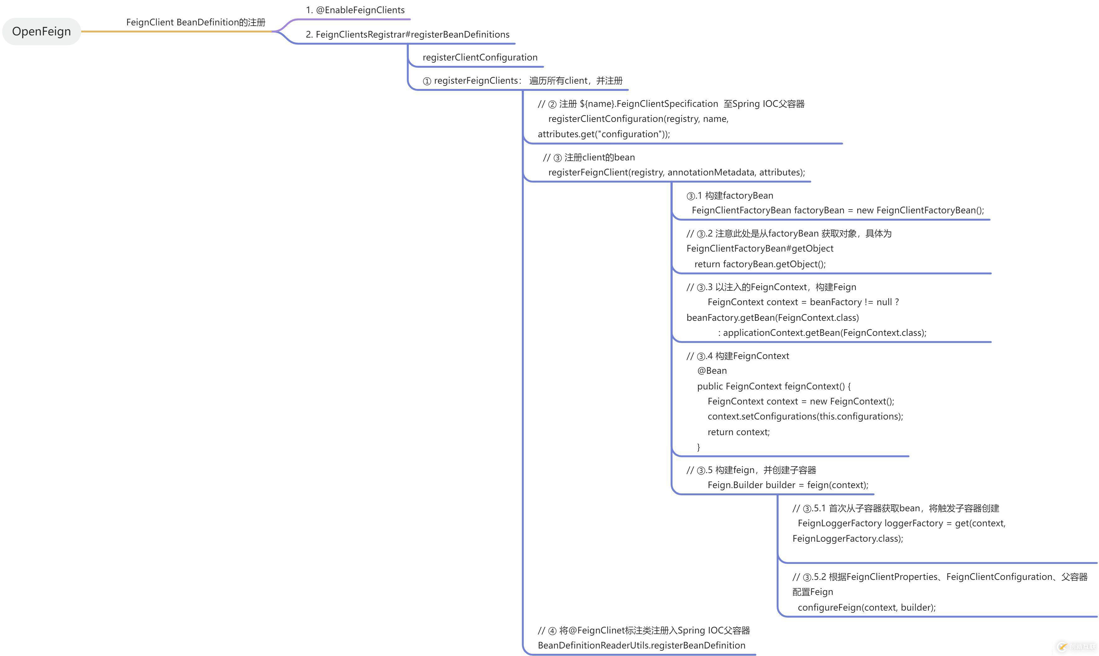 }其中,最核心的動作是@Import(FeignClientsRegistrar.class)FeignClientsRegistrar實現(xiàn)了ImportBeanDefinitionRegistrar接口,實現(xiàn)了一套自定義的BeanDefinition注冊流程。在SpringapplicationContext容器refresh的過程中(具體為invokeBeanFactoryPostProcessors->postProcessBeanDefinitionRegistry->processConfigBeanDefinitions)時,將調用FeignClientsRegistrar#registerBeanDefinitions