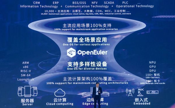 2022年11月9日,2022年世界互聯(lián)網(wǎng)大會烏鎮(zhèn)峰會在浙江烏鎮(zhèn)舉行,15項(xiàng)世界互聯(lián)網(wǎng)領(lǐng)先科技成果在活動期間發(fā)布。圖為歐拉開源操作系統(tǒng)(openEuler)在烏鎮(zhèn)展示,該操作系統(tǒng)以Linux穩(wěn)定系統(tǒng)內(nèi)核為基礎(chǔ),支持x86、ARM、RISC-V、LoongArch、SW64、Power六大處理器架構(gòu)。第三,擁抱開源,與世界協(xié)同創(chuàng)新。