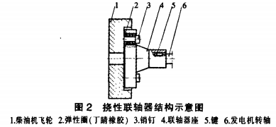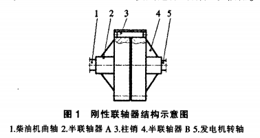 剛性聯軸器結構原理如圖l所示。它靠鋼制平鍵和圓柱銷傳遞扭矩。設計這種剛性聯軸器主要是根據柴油機的輸出馬力或發(fā)電機的輸入功率等,校核平鍵(圖中未畫出)的抗剪、抗擠壓強度和柱銷3的抗剪強度。雖然這種剛性聯軸器結構簡單、加工安裝較方便,但是聯軸器內沒有任何撓性元件,只是在發(fā)電機機座底腳下。墊橡膠來為柴油發(fā)電機組運行時減振。因此這種剛性聯軸器不能補償柴油機曲軸與電機轉軸回轉中心線不對中誤差。這種剛性聯軸器使得機組運行時振動較大。嚴重影響機組使用壽命。現在柴油發(fā)電機很少使用這樣的剛性聯軸器。