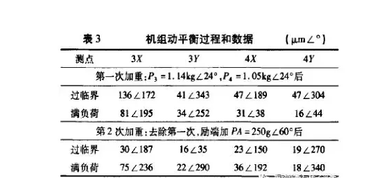 本次加重后,滿負(fù)荷下振動(dòng)明顯降低而臨界轉(zhuǎn)速下振動(dòng)變化不大,軸系振動(dòng)達(dá)到優(yōu)秀,動(dòng)平衡工作至此結(jié)束。表3給出了機(jī)組動(dòng)平衡過(guò)程。