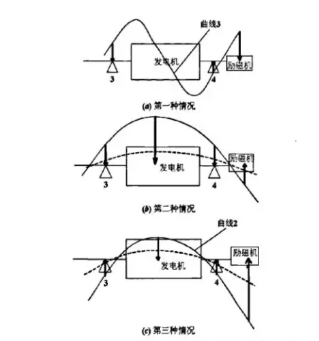 第2種情況下。平衡發(fā)電機(jī)工作轉(zhuǎn)速下振動(dòng)需要在兩端加向下的力,在轉(zhuǎn)子中部也應(yīng)該加1個(gè)向下的力。由于轉(zhuǎn)子中部無(wú)法加重.實(shí)際上只能在兩端加1對(duì)向下的力,或者在勵(lì)磁機(jī)懸臂端加一個(gè)向上的力。