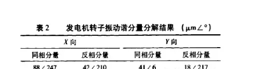 由表1可知,滿負(fù)荷下3x和4x相位相差27。,3Y和4Y相位相差20。,兩側(cè)x與y方向振動(dòng)相位基本相同。用諧分量法將3瓦、4瓦工作轉(zhuǎn)速下的振動(dòng)分解為同相分量和反相分量,如表2所示。