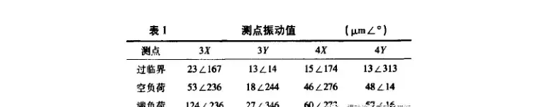 正常運(yùn)行中發(fā)電機(jī)振動(dòng)較大,表1給出了3瓦和4瓦空負(fù)荷和滿負(fù)荷下的振動(dòng)數(shù)據(jù)。