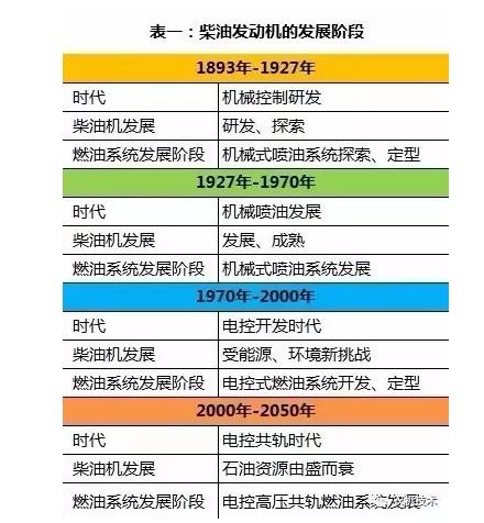 在這過去的120年以及今后的發(fā)展過程中,柴油發(fā)動機的發(fā)展經歷“兩個30年”,“兩個50年”,總體是從機械控制向電子控制方向發(fā)展,從研發(fā)、探索到成熟,節(jié)能與環(huán)保是當今及未來的總體發(fā)展目標。