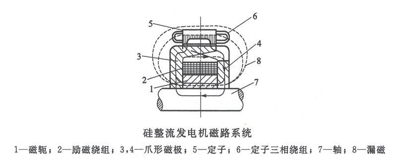 當電源總開關接入時(如下圖所示),電瓶電流量根據上邊控制器流入發(fā)電機的勵磁線圈,勵磁線圈周邊便造成磁通量,絕大多數磁通量根據磁軛1(如下圖所示)和爪形磁極3產生N極,再穿過電機轉子與定子中間的氣體隙,歷經定子的齒部和軛部,隨后再穿過氣體隙,進到另-爪形磁極4產生S極,最終返回磁軛,產生磁控制回路。另有一小部分磁通量在定子邊上的氣體隙中及N與S極中間根據,這一部分稱之為漏磁通。