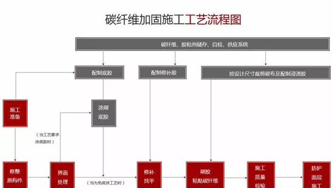 再次粘帖時,應嚴格按照碳纖維布的施工流程進行施工,正確的施工流程請看下圖: