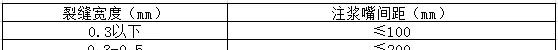 灌漿嘴的設(shè)置間距,參考下表。在裂縫的交錯處、裂縫較寬處以及裂縫兩端都有必須設(shè)置灌漿嘴。灌漿嘴不合理的設(shè)置也會導(dǎo)致灌縫膠不凝固,凝固不均勻。