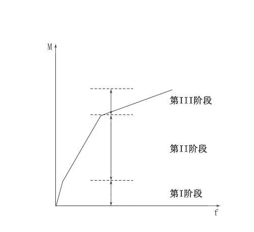 已有“適量加固梁”試驗(yàn)結(jié)果表明,不考慮二次受力情況,碳纖維布加固梁隨著荷載逐級(jí)施加到受壓區(qū)混凝土壓碎,大致經(jīng)歷三個(gè)過程。此類梁的典型彎矩—跨中撓度曲線如下圖所示: