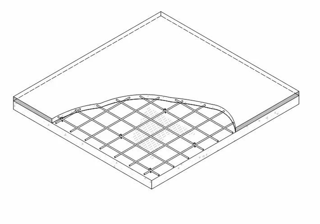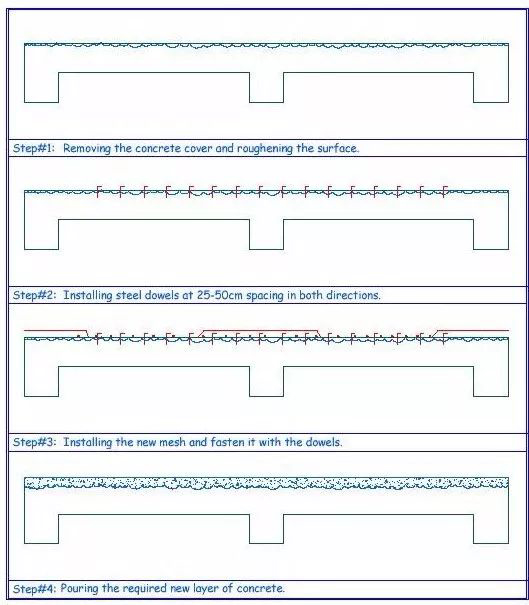現(xiàn)在,主要講一下新增混凝土層加固。首先,如果樓板是房間四周的裂縫較多,或者下部鋼筋本身良好,只是配筋量稍微不足或混凝土強(qiáng)度不足,那么基本都可以從現(xiàn)有樓板上部增加不小于40mm的新混凝土層來加固,理論上新增厚度越大越好,但是同時(shí)新增混凝土層的重量越重,要考慮現(xiàn)有樓板鋼筋和基礎(chǔ)的承載力。