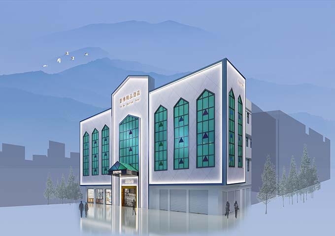 商務(wù)酒店的墻體結(jié)構(gòu)大量使用透明材質(zhì),達到光照效果,有利于室內(nèi)外光線和景色的融合,帶給人親近自然的感受,視覺上具有通透感,達到親近自然的感受。整個空間布局比較規(guī)整。