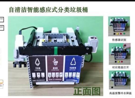 同樣來自于的愚一小學(xué)向紅分校的許裴琳同學(xué)帶來了“自清潔智能感應(yīng)式分類垃圾桶”的作品,通過顏色感應(yīng)組件自動識別幾種垃圾顏色,聯(lián)動對應(yīng)運(yùn)動組件動作,自動開啟對應(yīng)的不同的垃圾桶蓋。當(dāng)識別到高溫垃圾的時候還能觸發(fā)聲音報警,同時啟動自動沖洗裝置。