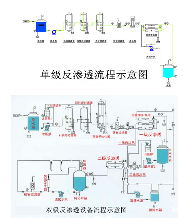 反滲透分為單級(jí)反滲透和雙級(jí)反滲透,也可以稱(chēng)為一級(jí)反滲透設(shè)備和二級(jí)反滲透設(shè)備。一級(jí)反滲透和二級(jí)反滲透設(shè)備區(qū)別在于工藝上面二級(jí)反滲透是將一級(jí)反滲透的純水再一次進(jìn)入反滲透膜進(jìn)行凈化,出來(lái)的水更加純凈。
