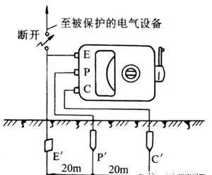 ①用最短的專用導(dǎo)線將接地體與接地測量儀的接線端“E1”(三端鈕的測量儀)或與C2、P2”短接后的公共端(四端鈕的測量儀)相連。