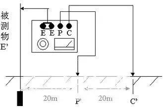 ③用余下的長度居中的專用導(dǎo)線將距接地體⒛m的測量探針(電位探針)與測量儀的接線端“P1”相連。