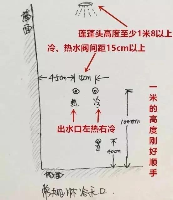 冷熱水,出水閥做在80-120cm的高度是最適宜的,間距15cm,不能有誤差!蓮蓬頭高度至少要比家里高的人身高高20厘米!水閥注意左熱右冷,距離墻面不能小于45cm,不然洗澡會撞到墻!淋浴房離地35-55cm范圍內裝一個冷水口,以后裝上水龍頭方便接水!