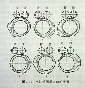 2、結構因素的影響。對于側(cè)置氣門式發(fā)動機,由于進入柴油發(fā)電機組汽缸內(nèi)的新鮮混合氣對進氣門相對的汽缸壁附近的沖刷作用,使其溫度降低,再加之混合氣中細小油滴對潤滑膜的破壞,給酸性物質(zhì)產(chǎn)生創(chuàng)造了條件,并且使酸性物質(zhì)有可能直接腐蝕汽缸壁,加速了該處磨損,因此,與進氣門相對的汽缸壁附近,以及在冷卻水套與冷卻效率最大的汽缸壁附近磨損最大,從而使汽缸沿圓周方向“失圓”。圖3-21是側(cè)置氣門式發(fā)動機各汽缸橫斷面磨損情況示意圖。正因如此,不同結構的柴油發(fā)電機組,汽缸“失圓”的長短軸是不一樣的。