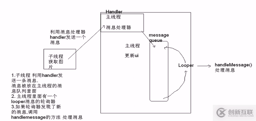 3、UI操作只能在主線程執(zhí)行,如果子線程要修改UI,則通過handler消息處理機(jī)制,首先在主線程創(chuàng)建一個(gè)消息處理器handler對(duì)象,然后子線程通過消息處理器handler發(fā)送一個(gè)消息給主線程,消息按時(shí)間順序從小到大將被放在主線程的消息隊(duì)列里面,主線程里面有一個(gè)looper消息的輪詢器,如果輪詢器發(fā)現(xiàn)了消息,則調(diào)用handlerMessage方法處理消息。大概原理機(jī)制如下圖所示:
