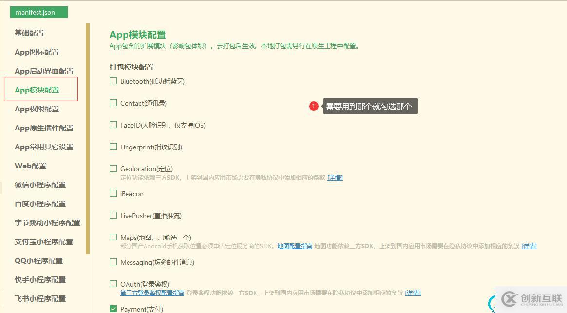 成都創(chuàng)新互聯(lián)公司自2013年起,先為平山等服務(wù)建站,平山等地企業(yè),進(jìn)行企業(yè)商務(wù)咨詢服務(wù)。為平山企業(yè)網(wǎng)站制作PC+手機(jī)+微官網(wǎng)三網(wǎng)同步一站式服務(wù)解決您的所有建站問題。2.在mainfest.json/App模塊配置 中設(shè)置payment支付