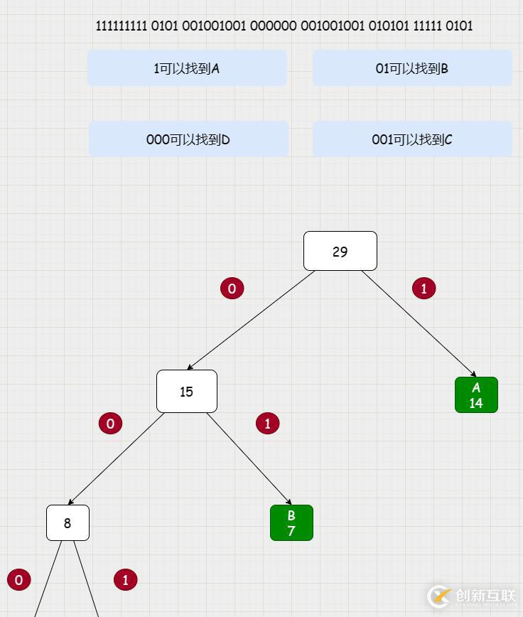 的路徑是最短的,而使用頻率最小的D,從根節(jié)點(diǎn)到D的距離是最長(zhǎng)的。這路勁長(zhǎng)短正好對(duì)應(yīng)了使用頻率的高低。如果一個(gè)節(jié)點(diǎn)鏈接left節(jié)點(diǎn)用 0 表示;鏈接 right 節(jié)點(diǎn)用 1表示;(反過(guò)來(lái)也可以)那么從root節(jié)點(diǎn)到葉子節(jié)點(diǎn)的路徑就可以用01
