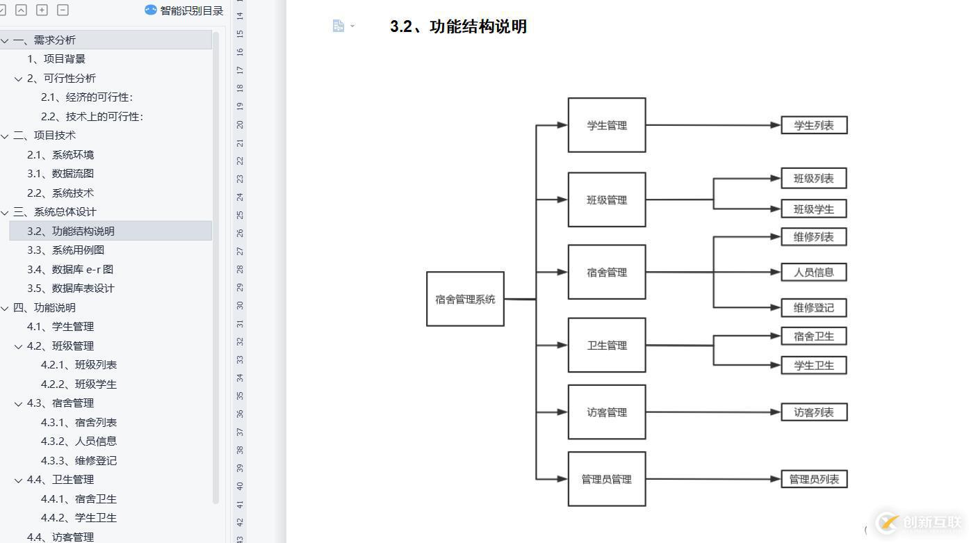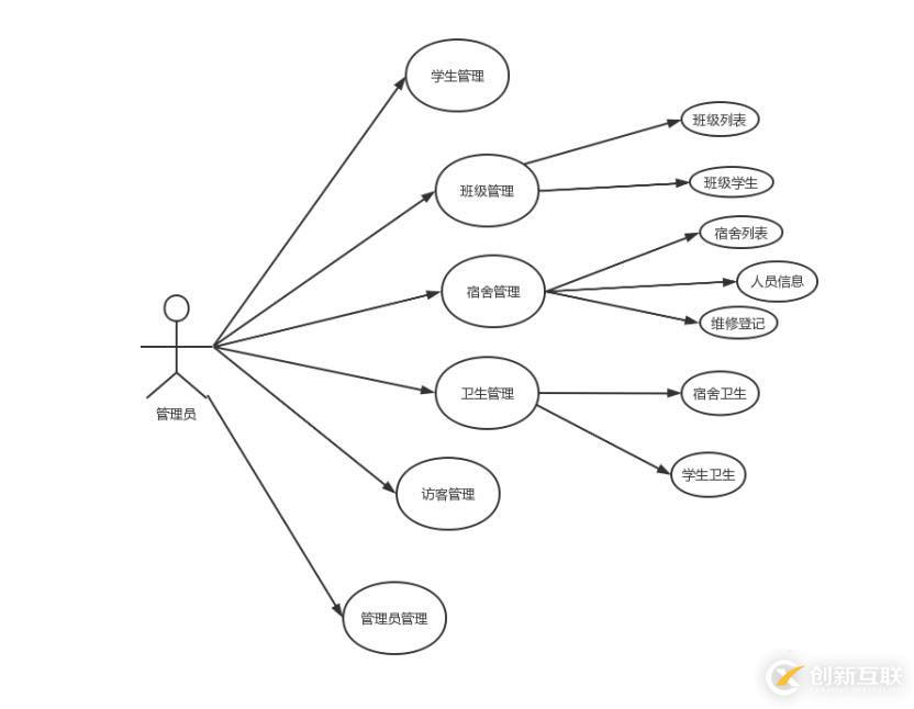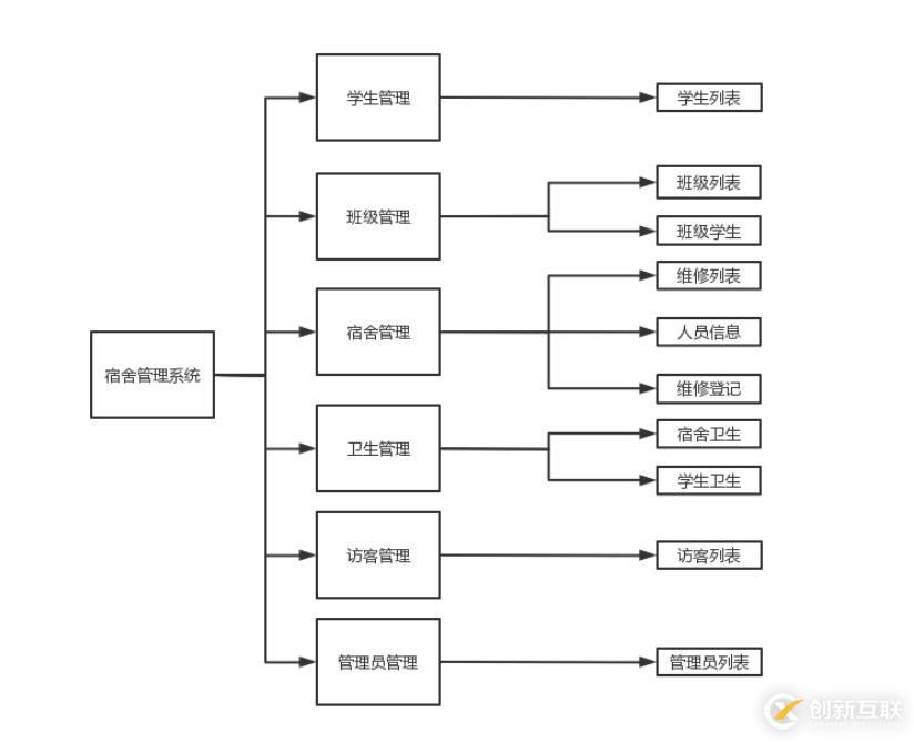 三、功能簡介該系統的功能包括學生管理、班級管理、宿舍管理、衛(wèi)生管理訪客管理和管理員管理,具體功能結構圖如下圖