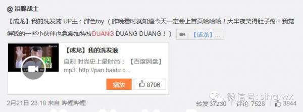 它來(lái)自于一個(gè)叫“三次元鬼畜”的網(wǎng)友上傳的一段搞笑視頻。25日前的所有新浪微博均引用自這個(gè)視頻地址:http://www.bilibili.com/video/av2023391/ 。視頻比較搞笑,同時(shí)涉及成龍,又是在春節(jié)期間,同時(shí)選擇了微博作為主傳播渠道,傳播元素具備,只欠東風(fēng)。