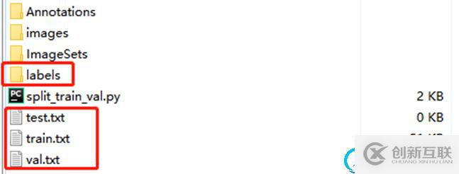 運(yùn)行后會生成如下laels文件夾和三個包含數(shù)據(jù)集的txt文件,其中l(wèi)abels中為不同圖像的標(biāo)注文件,train.txt等txt文件為劃分后圖像所在位置的絕對路徑,如train.txt就含有所有訓(xùn)練集圖像的絕對路徑。