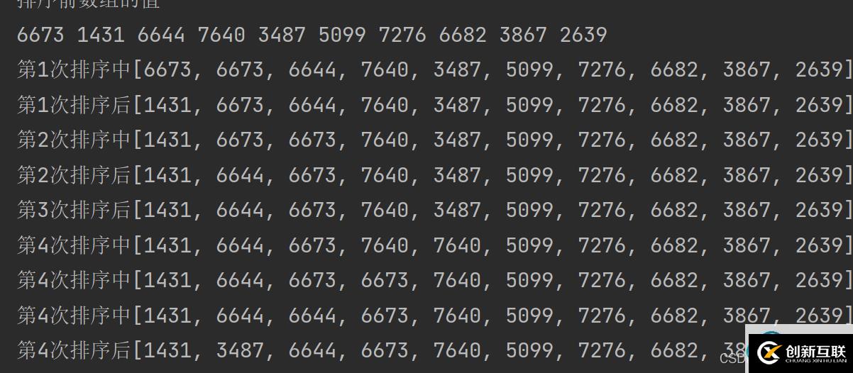 外層循環(huán)變量i從1開始 數(shù)組后面的9個(gè)元素需要進(jìn)行插入操作 每次循環(huán)后已經(jīng)排序的部分長度加1