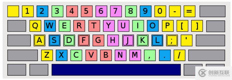 有很多網(wǎng)站教授正確的打字。下圖描述了基本原理: 用同一手指按壓顏色相同的鍵。黃色鍵需要用小指按壓,藍(lán)色的用無名指,綠色的用中指,紅色的用食指。