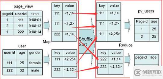 map 端:以 JOIN ON 條件中的列作為 Key,以page_view表中的需要字段,表標(biāo)識(shí)作為value,最終通過key進(jìn)行排序,也就是join字段進(jìn)行排序。