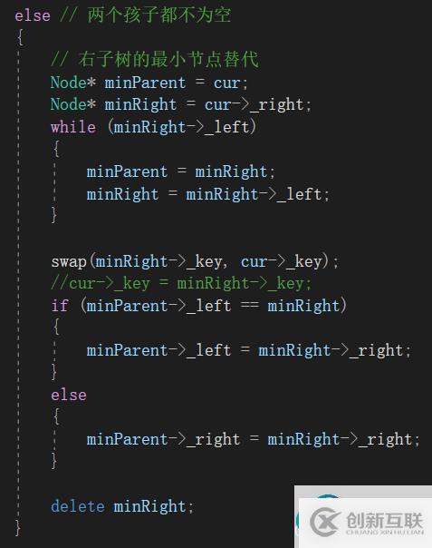 上面圖三所示的代碼是有BUG的,因?yàn)橛锌赡軇h除結(jié)點(diǎn)的右子樹的根就是最小結(jié)點(diǎn),如下圖一所示,要?jiǎng)h除值為8的結(jié)點(diǎn)(根節(jié)點(diǎn)),此時(shí)該節(jié)點(diǎn)右子樹的根(值為10的結(jié)點(diǎn))就是最小結(jié)點(diǎn)。開始minRight指向值為10的結(jié)點(diǎn),while循環(huán)判斷條件為假不進(jìn)入循環(huán),minRight最終指向值為10的結(jié)點(diǎn),也就是右子樹的最小結(jié)點(diǎn),而minParent指針為空,minParent指針應(yīng)該為值為8的結(jié)點(diǎn),所以應(yīng)該用cur對(duì)minParent指針初始化。并且此時(shí)minParent指針指向結(jié)點(diǎn)的_right指針和minRight指針指向結(jié)點(diǎn)的_right指針鏈接(此時(shí)一定是minParent指針指向結(jié)點(diǎn)的_right指針指向minRight指針指向的結(jié)點(diǎn),minRight指針指向結(jié)點(diǎn)的_left指針一定是NULL,_right指針可能為空可能指向其他結(jié)點(diǎn),所以要?jiǎng)h除minRight指針指向結(jié)點(diǎn)直接將minParent指針指向結(jié)點(diǎn)的_right指針指向minRight指針指向結(jié)點(diǎn)的_right指針指向的地址,然后釋放minRight指針指向結(jié)點(diǎn)即可),釋放minRight指針指向的結(jié)點(diǎn)。代碼中,因?yàn)樽詈髆inRight指針指向結(jié)點(diǎn)既有可能是minParent指針指向結(jié)點(diǎn)的左節(jié)點(diǎn)也有可能是minParent指針指向結(jié)點(diǎn)的右節(jié)點(diǎn),因此需要進(jìn)行判斷,如下圖二所示。