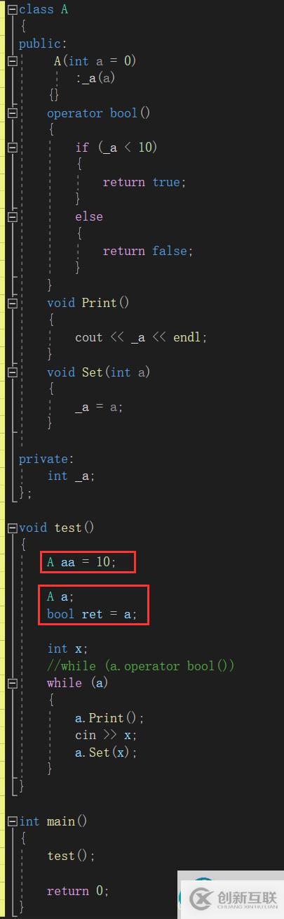 其實(shí)也可以使用類似operator int()的函數(shù)來滿足類似int y = a和while(a),將A類型的對(duì)象a隱式類型轉(zhuǎn)換成對(duì)應(yīng)類型的功能,如下圖二所示。