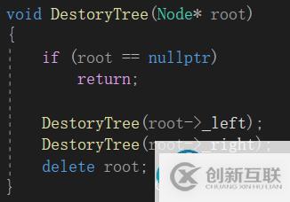 搜索二叉樹的析構(gòu)函數(shù),我們寫一個(gè)DestoryTree函數(shù)來銷毀釋放樹,如下圖一所示,然后二叉樹的析構(gòu)函數(shù)復(fù)用DestoryTree函數(shù)即可,如下圖二所示