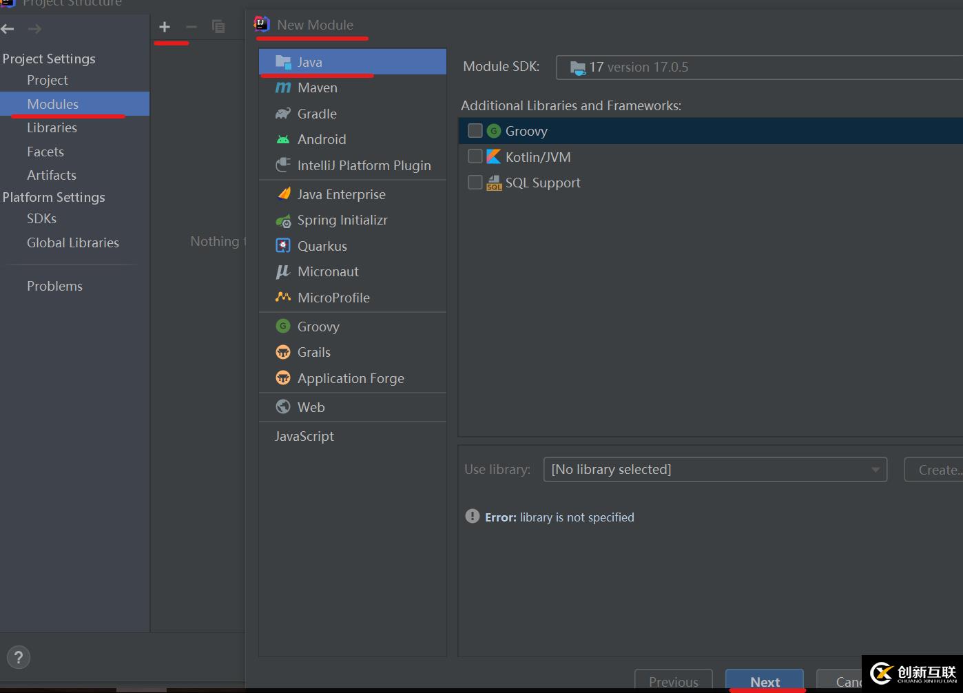 點擊+號選擇New Module,選擇Java,點擊Next