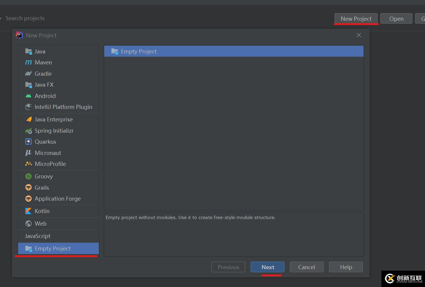(2)新建一個Hello word!①創(chuàng)建project(項目,工程),如下點擊Next后,確定文件所放目錄以及文件名,初期學習可以選擇Empty Project,因為選擇java可能有一些東西用不到