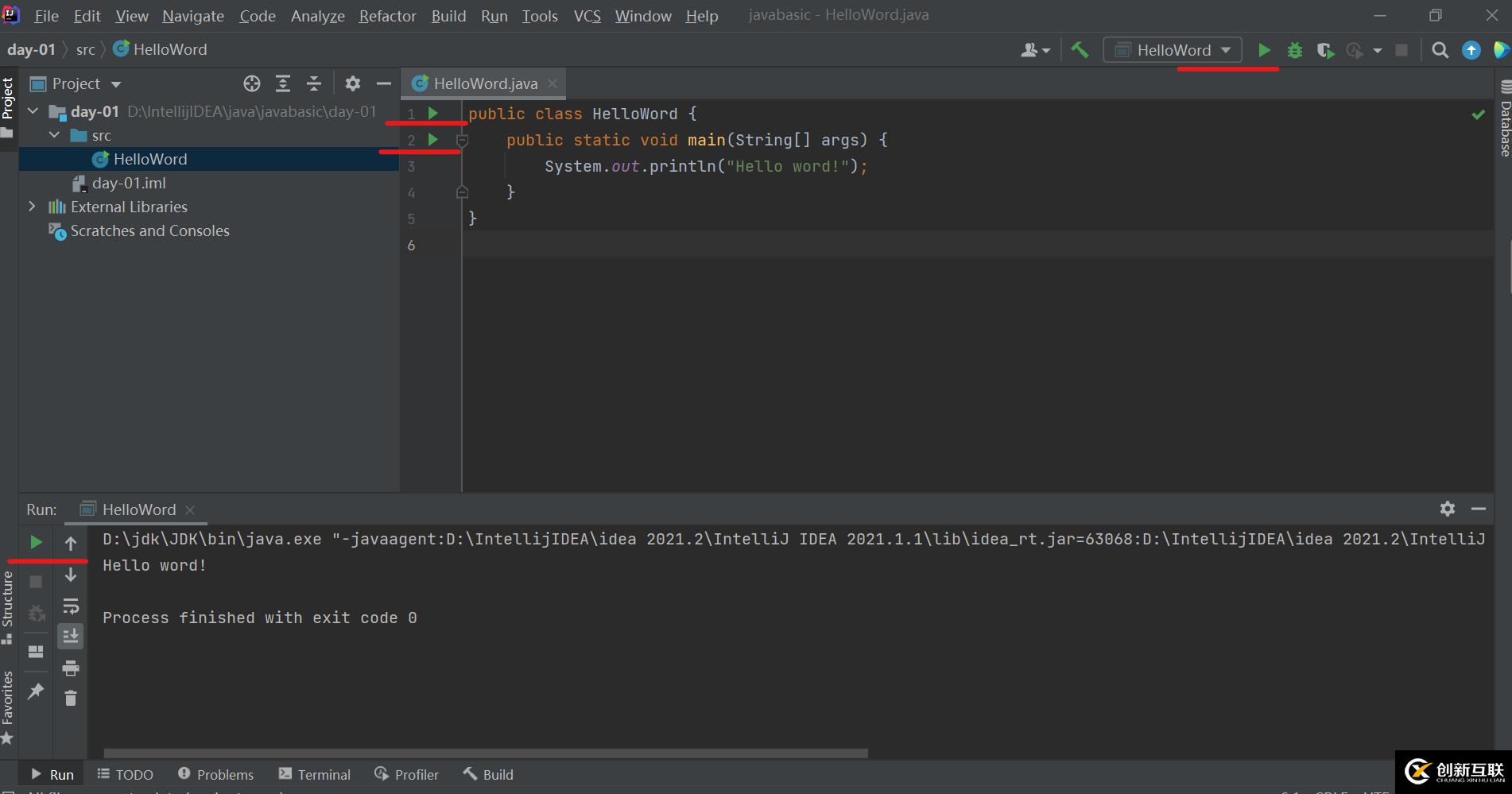 ③編寫相應(yīng)代碼,點擊功能區(qū)綠色的運行標,運行程序Hello Word!