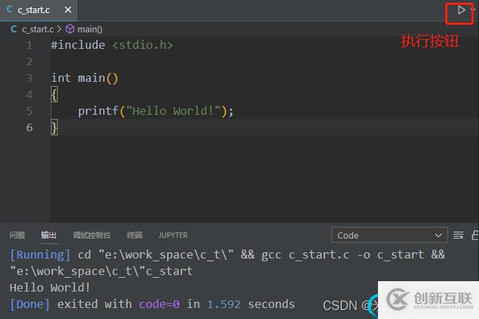 四. 結(jié)果測(cè)試新建一個(gè).c文件, 編寫代碼, 點(diǎn)擊 右上角 執(zhí)行按鈕(側(cè)三角), 編譯執(zhí)行