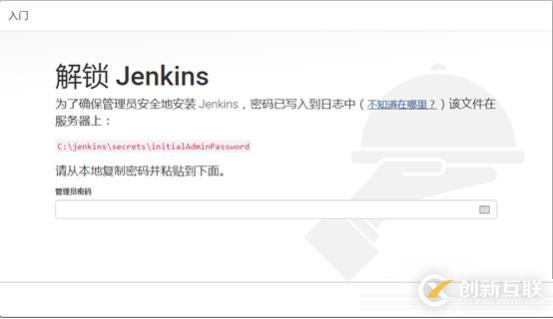 出現(xiàn)解鎖 Jenkins界面,說明jenkins項目搭建完成,這里需要輸入管理員密碼。如下圖: