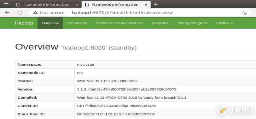 刷新網(wǎng)頁(yè)后,hadoop1的NameNode可以訪問(wèn)且變成了Standby NameNode,hadoop2的NameNode是Active NameNode。