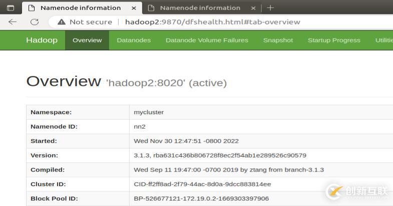 (2)Hadoop的Web UI界面在瀏覽器網(wǎng)址欄輸入:http://hadoop1:9870/? 和??http://hadoop2:9870/