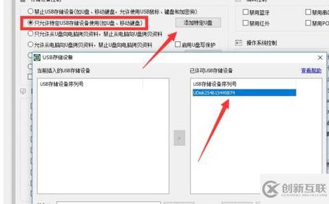 勾選“只允許特定的usb存儲設備使用”,同時點擊右側(cè)的“添加特定U盤”按鈕,此時就可以對特定進行訪問的U盤進行添加操作了。