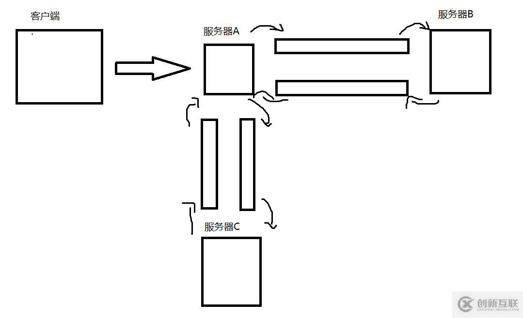 上圖中,客戶端調(diào)用了服務(wù)器A,服務(wù)器A需要去調(diào)用服務(wù)器B去完成一些任務(wù),此時(shí)服務(wù)器A就務(wù)必要清楚服務(wù)器B的存在,那么服務(wù)器A中的代碼就要和服務(wù)器B有關(guān)聯(lián)。