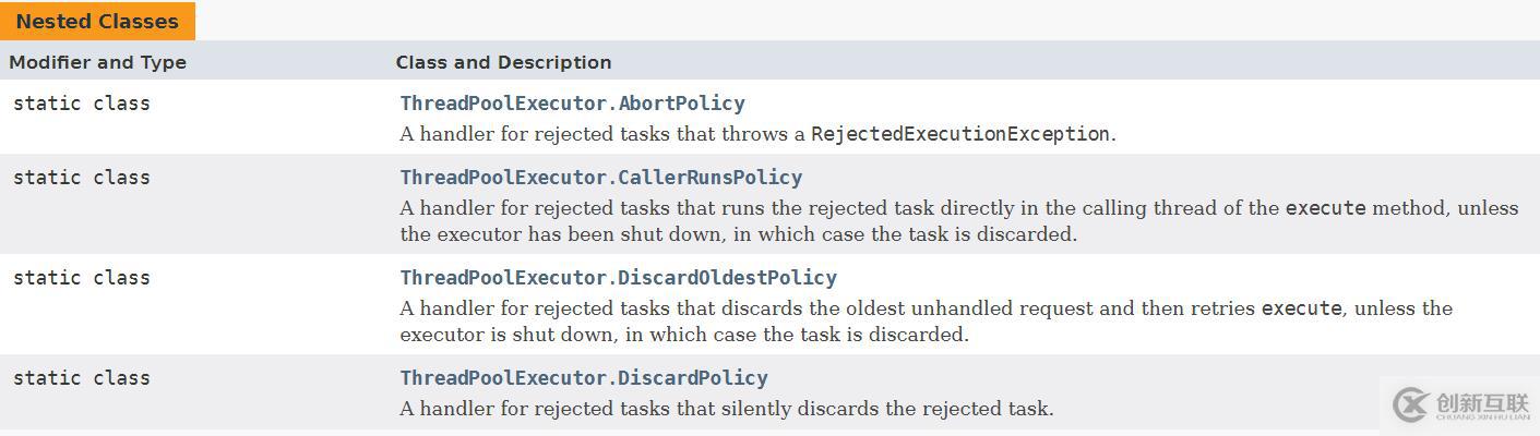 標(biāo)準(zhǔn)庫(kù)中提供了四種線程池的拒絕策略,如下: